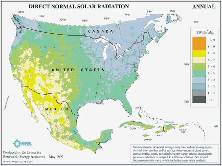 The solar resources for generating power from Concentrating Solar Power systems is plentiful. For instance, enough electric power for the entire country could be generated by covering about 9 percent of Nevada – a plot of land 100 miles on a side – with parabolic trough systems. |