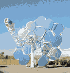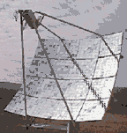The dish, which is more specifically referred to as a concentrator, is the primary solar component of the system. It collects the solar energy coming directly from the sun (the solar energy that causes you to cast a shadow) and concentrates or focuses it on a small area. The resultant solar beam has all of the power of the sunlight hitting the dish but is concentrated in a small area so that it can be more efficiently used. Glass mirrors reflect ~92% of the sunlight that hits them, are relatively inexpensive, can be cleaned, and last a long time in the outdoor environment, making them an excellent choice for the reflective surface of a solar concentrator. The dish structure must track the sun continuously to reflect the beam into the thermal receiver.